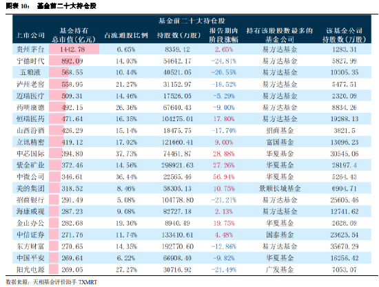 贵州茅台、宁德时代、五粮液为本期基金持有总市值的前三名。基金前二十大持仓股中有 10 只上涨,涨幅最高的三只分别为中微公司、中芯国际和紫金矿业,报告期内分别上涨 56.94%、28.88%和 27.26%。上表还列出了基金前二十大持仓股对应持有股数最多的基金公司,可以看出易方达基金对前二十大重仓股持有占比最高。