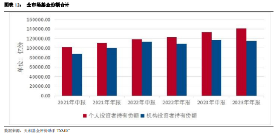 根据 2023 年年报,个人投资者持有基金 141338.61 亿份,占比 55%,较 2023 年中报增长 7500.47 亿份。机构投资者持有基金 114797.38 亿份,占比 45%,较 2023 年中报减少 2209.88 亿份。
