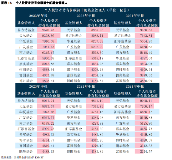 从个人投资者持有份额来看,易方达基金个人投资者持有份额升至 9570.23 亿份,保持第一;天弘基金个人投资者持有份额较 2023 年中报数据小幅增加,位列第二。