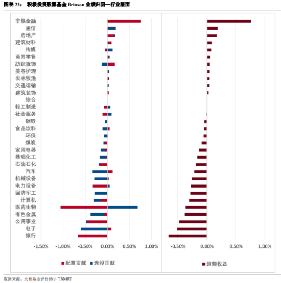 以沪深 300 指数为基准,非银金融、通信和电力设备是主动权益基金收益的主要来源,非银金融的超额收益主要来自于配置贡献,通信和电力设备的超额收益主要来源于选股贡献。