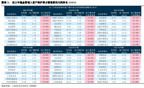 在客户维护费方面,筛选管理费在 5 亿以上的基金管理人,按照客户维护费占管理费的比例排序得到前十名基金管理人。客户维护费比例高低,体现出基金管理人在渠道方面投入的相对重视程度。