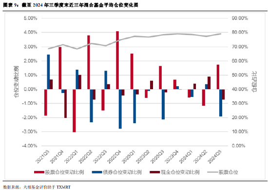 2024年三季度,全市场混合基金股票平均仓位较上期增加1.73个百分点,由上季度的77.32%上升至79.05%; 债券平均仓位较上期减少 1.94 个百分点,由上季度的 14.15%下降至 12.21%。本季度 A 股行情先抑后扬,混合 基金继续保持高股票仓位运作。