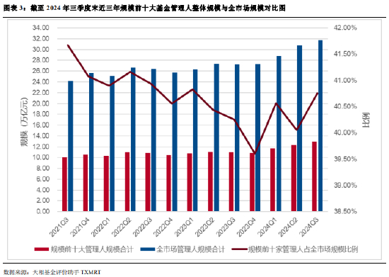 截至 2024 年三季度末,规模前十大管理人规模合计12.92 万亿元,全市场基金管理人规模合计31.71 万亿元,规模前十大管理人规模占比为 40.75%,占比较上季度末增加 0.70 个百分点。近三年,前十大管理人合计规模占比整体呈现下降趋势,然而近一年有所回升。