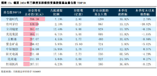 截至 2024年三季度末,天相一级分类中股票基金(不含指数型基金)和混合基金的重仓股 TOP10 如下表所示,宁德时代排名榜首,贵州茅台第二、立讯精密第三。