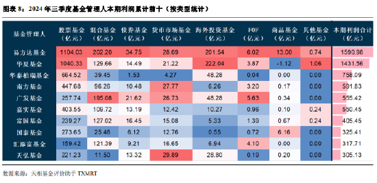 对基金管理人 2024 年三季度的利润按天相基金一级分类进行汇总,如下图所示。易方达基金的总利润高达 1590.98 亿元。