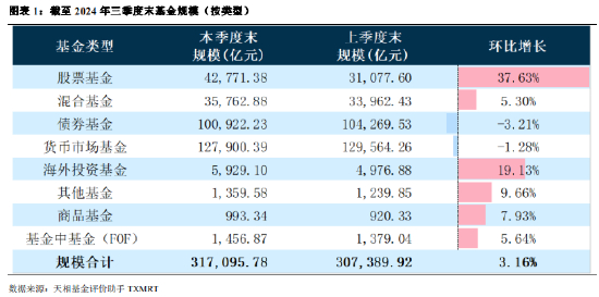截至 2024 年 10 月 25 日,共 157 家公募基金管理人披露了 2024年三季报,整体规模为 31.71 万亿元(含估算,不含集合资产管理计划),环比 2024 年二季度 30.74 万亿规模增长 3.16%,同比 2023 年三季度 27.21 万亿规模增长 16.52%。其中,天相一级分类股票基金及海外投资基金规模环比增长较高,分别为 37.63%和 19.13%,而债券基金和货币市场基金规模环比下降 3.21%、1.28%。