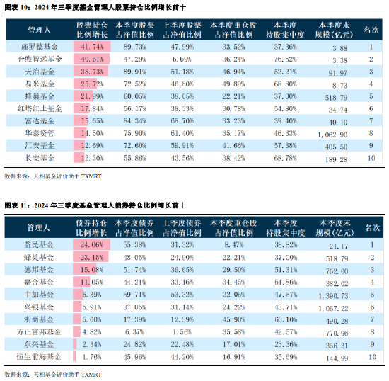 从基金管理人角度看,施罗德基金、合煦智远基金、天治基金、易米基金、蜂巢基金、红塔红土基金、富达 基金、华泰资管、汇安基金、长安基金,增加了股票的持仓比例;益民基金、蜂巢基金、德邦基金、嘉合基金、 中加基金、兴银基金、浙商基金、方正富邦基金、东兴基金、恒生前海基金,增加了债券的持仓比例。