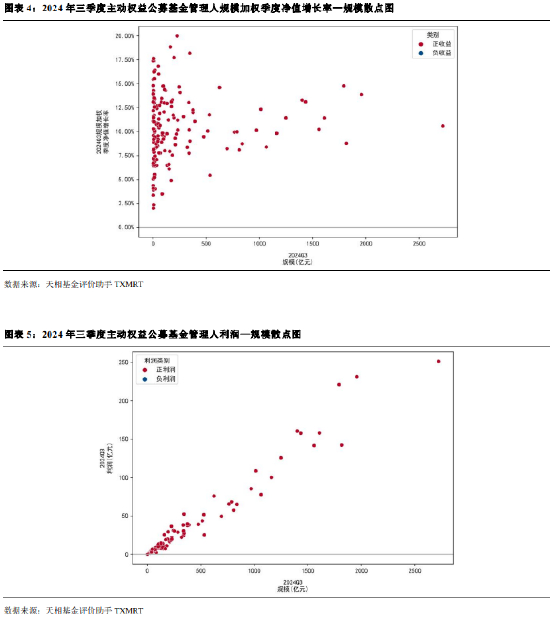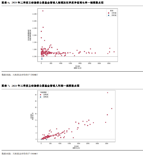 从全市场角度看,全部主动权益公募基金管理人在 2024 年三季度实现正收益,规模加权季度净值增长率在 0% 到 20%之间,规模较大的管理人集中分布在 15%以内。