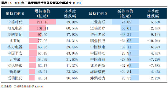 2024 年三季度,积极投资偏股型基金增持前三是宁德时代、阳光电源和美的集团,增持市值分别为 211.16、 131.11 和 97.60 亿元;减持前三是工业富联、迈瑞医疗和泸州老窖,减持市值分别为 74.89、50.61 和 48.21 亿元。 从三季度涨跌幅来看,增持 TOP10 股票全部上涨,其中宁德时代、阳光电源、中国平安和恒瑞医药涨幅均超过 35%;减持 TOP10 股票涨跌各半,最大涨幅不超过 10%。