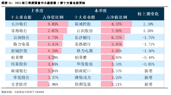 由上表可知,三季度国富中小盘股票 A 前十大重仓股变动较小,仅招商蛇口、潍柴动力和保利发展为新增, 其他重仓股占净值比的变动幅度绝对值均不超过 3%,排名前三位的新城控股、百润股份和长沙银行占净值比分 别为 8.35%、7.99%和 6.33%。