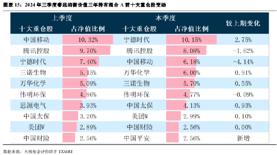 由上表可知,三季度睿远均衡价值三年持有混合 A 前十大重仓股变动较小,仅中国平安为新增,除了中国 移动之外的其他重仓股占净值比的变动幅度绝对值均不超过 3%,排名前三位的宁德时代、腾讯控股和中国移动 占净值比分别为 10.15%、8.08%和 6.18%。