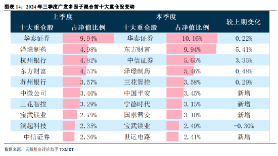 由上表可知,三季度广发多因子混合前十大重仓股变动较小,仅 4 只为新增,排名前三位的华泰证券、东方 财富和中信证券占净值比分别为 10.16%、9.94%和 5.65%,仓位较上期均有所增加。