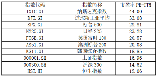 全球主要资本市场估值对比