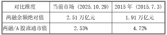 Wind数据显示,截至10月29日,A股两融余额报2.51万亿元,10月以来始终维持在2.4万亿元以上。当前两融余额占流通市值比例为2.53%,处于近十年中位水平,远低于2015年7月3日4.72%的高点。