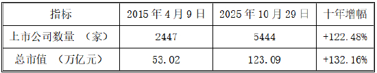 从市场容量看,A股上市公司的数量与总市值均已实现跨越式增长,市场深度与广度显著提升。据Wind数据,截至2025年10月29日,A股上市公司数量较2015年4月9日的2447家跃升至5444家,增幅达122%;总市值则从53万亿元扩张至123万亿元,增幅高达132%。