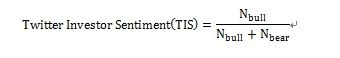 在整个收集数据以及制作情绪指标的过程中,作者运用了一些量化的手法。比如说,在利用Twitter数据计算指标Twitter投资者情绪时,如果一条Twitter中包含了“牛市”这个词,那么就认为这条Twitter是看多的;反之,如果Twitter中包含了“熊市”,就认为该Twitter是看空的。统计出一天内看多和看空的Twitter的数量,再基于此定义投资者情绪得分,即投资者情绪指标为: