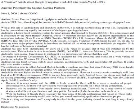 除了从搜索量的角度研究大数据与金融的关系以外,从文本语义分析的角度进行研究也非常热门。在2014年牛津大学期刊发表的一篇文章中,作者发现通过分析投资者在网络发帖和评论中表现出来的观点也能够有效地预测未来股市的收益。作者使用的原始数据来自于投资者在美国最大的投资社交网站Seeking Alpha发表的文章和评论以及道琼斯新闻服务网站DJNS上的新闻报道和评论,在经过一系列的文本识别方法和算法对内容进行辨识和分析后,定义报道或评论的负面率为文章中负面词汇的个数占总字数的比例,代表其对于股票的多空态度。下面图4-7是在Seeking Alpha网站上针对的GOOGLE的几篇正面和负面的新闻报道和评论,其中图4是关于GOOGLE的负面报道,报道篇幅总字数为494个,其中负面词汇字数为12个,报道的负面率为2.43%;图5是关于GOOGLE的正面报道,篇幅总字数为447个,其中负面词汇字数为0,报道的负面率为0%。图6是关于GOOGLE的两条负面评论,负面率分别为2.4%和5.23%;图7是关于GOOGLE的两条正面评论,负面率分别为1.26%和0.58%。