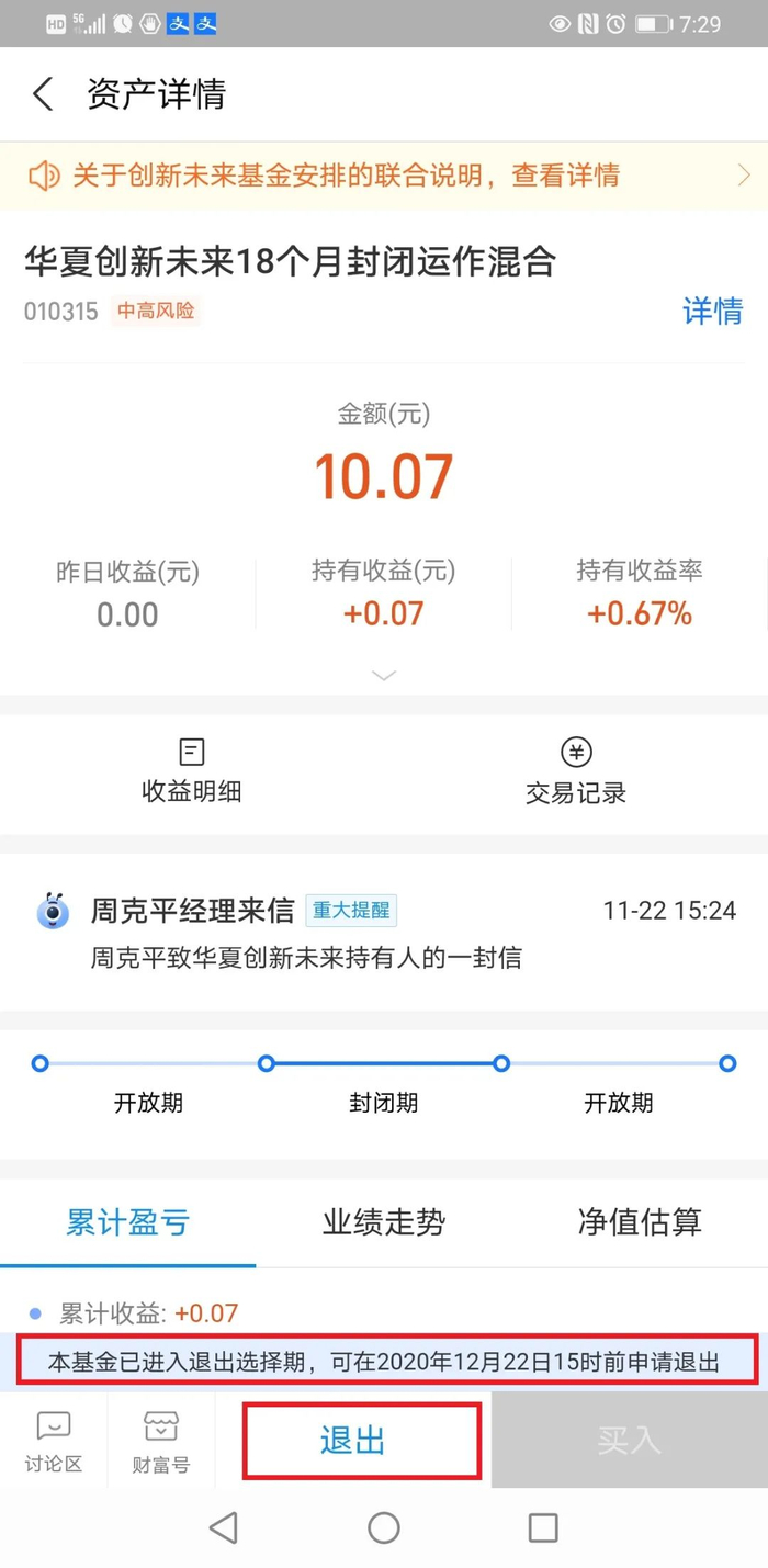 一大早,基金君打开自己的支付宝页面,看到5只创新未来基金的页面上均增加了“退出”按钮,同时页面上提示“本基金已进入退出选择期,可在2020年12月22日15点前申请退出。”