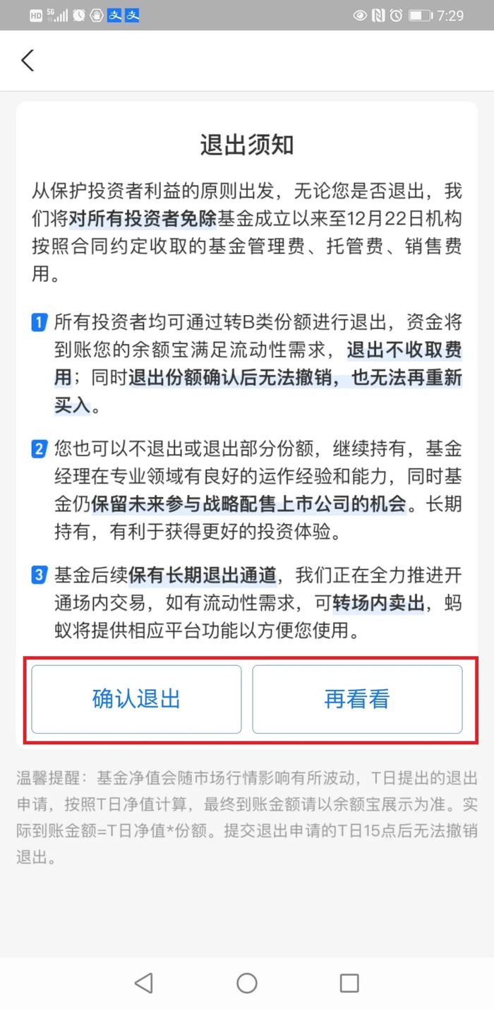 基金君点击了“退出”按钮之后,进入了“退出须知”界面,“退出须知”中提到,将对所有投资者免除基金成立以来至12月22日的基金管理费、托管费、销售费用。