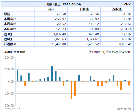 资金面,受俄乌局势影响,今日北向资金也承压,小幅流出了33.58亿元,其中沪股通流出23.56亿元,深股通流出10.02亿元。