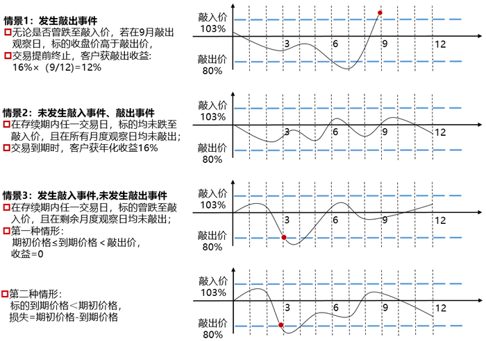 目前,市场上证券公司发行的雪球产品以挂钩中证500指数为主,我们以收益率16%、敲入点位80%、敲出点位103%、1年期的中证500指数雪球产品为例,分析雪球产品的四种损益情形: