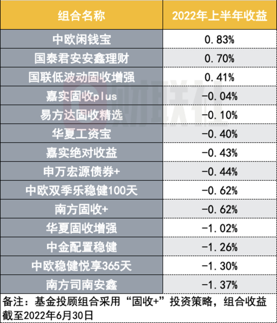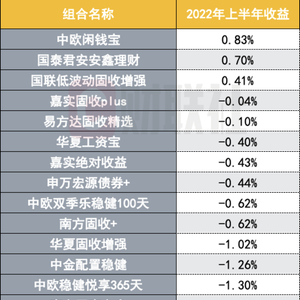 其中,中欧闲钱宝、国泰君安安鑫理财、国联低波动固收增强组合上半年收益均为正,分别为0.83%、0.7%、0.41%。而嘉实固收PLUS、易方达固收精选、华夏工资宝、嘉实绝对收益、申万宏源债券+、中欧双季乐稳健100天、南方固收+这八只组合上半年收益优于-1%。