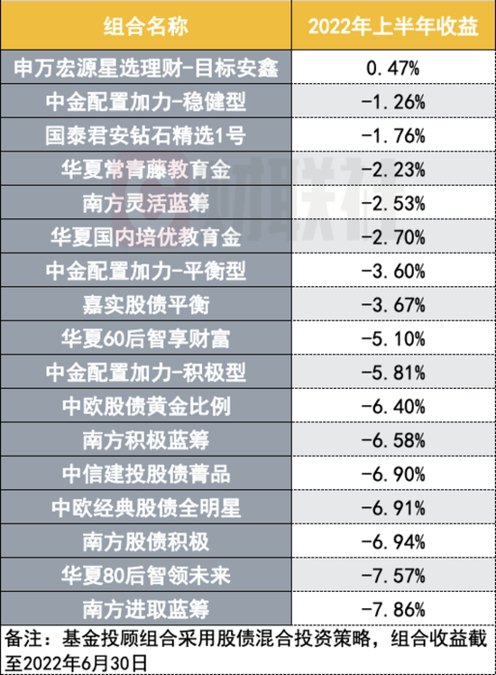 在17只采取“股债混合策略”的投顾组合中,今年上半年收益在1%至-7%之间,平均收益约为-4.55%。