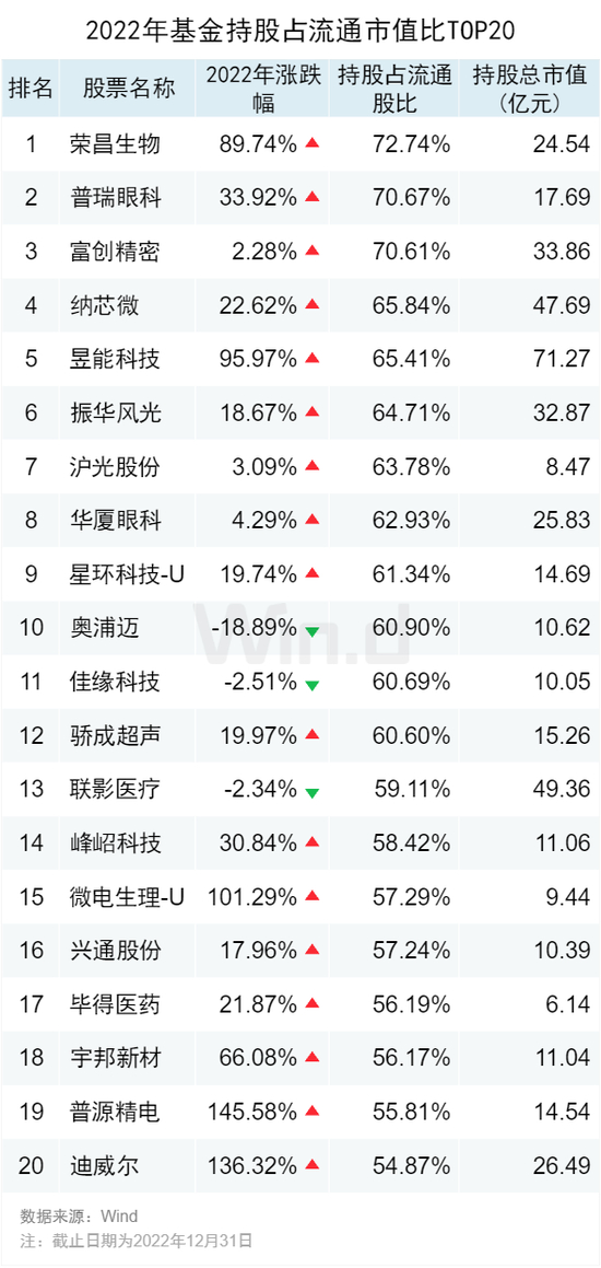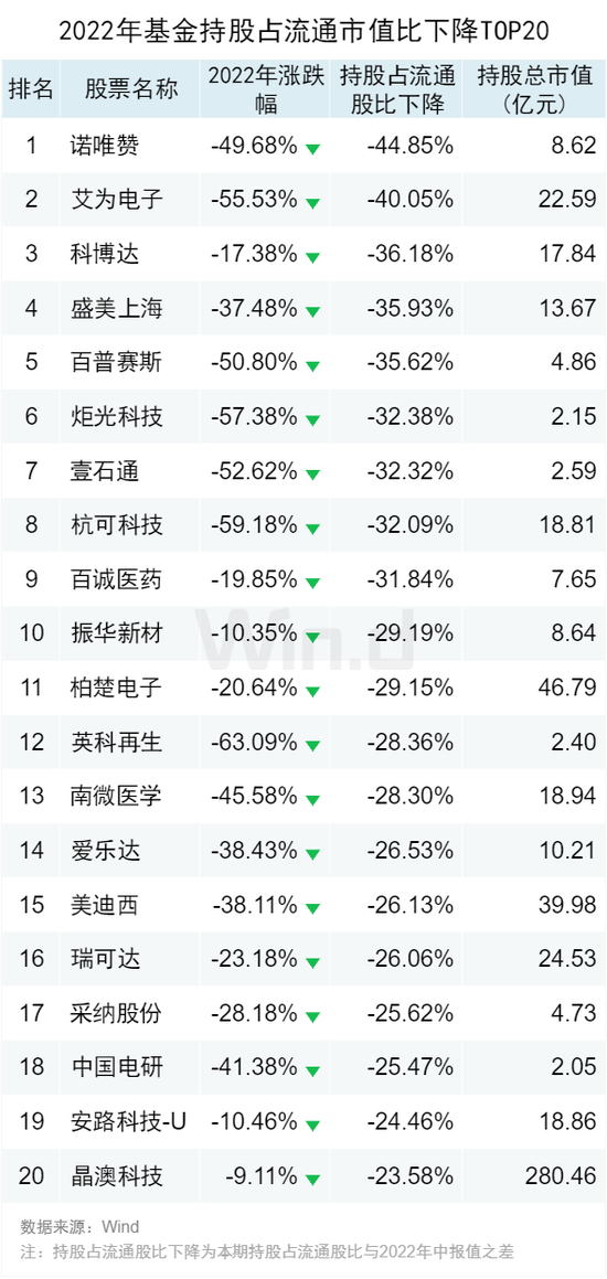 2022年,基金减持占流通市值比居前的股票跌幅均超过20%,减持比例最高的诺唯赞2022年股价下跌44.85%。