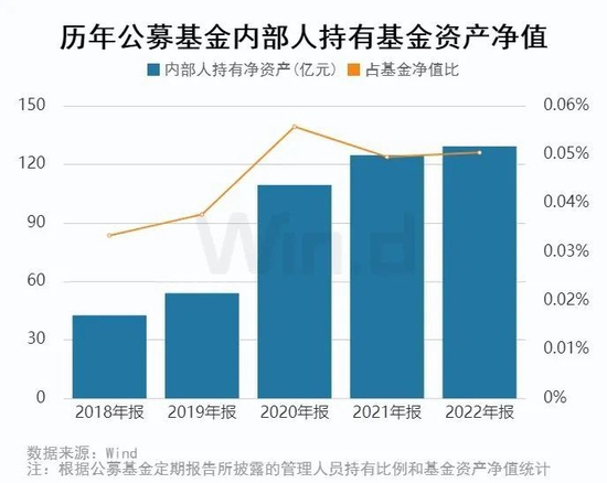 基金公司内部人持有基金的市值反映了基金从业人员对其所管理的基金的信心。近年基金内部人持有基金资产净值规模持续上升,2022年合计持有超129亿元,较去年底上涨3.65%。