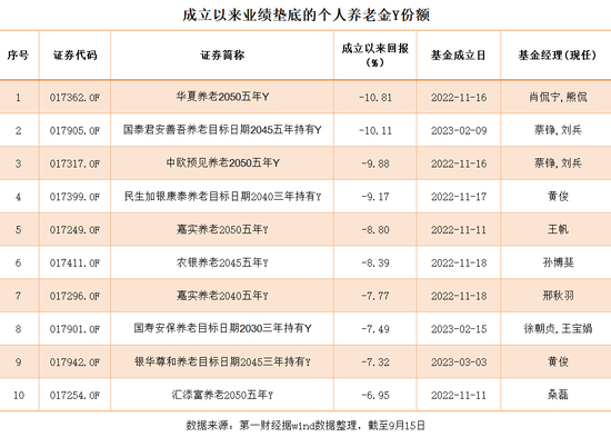 数据显示,截至9月15日,在154只有数据显示的养老目标基金Y份额产品中,有近八成产品年初迄今出现了不同程度的亏损,而自成立以来回报为正的产品仅有21只。其中,表现最高者中欧预见养老2025一年持有(FOF)Y自成立以来的累计涨幅不足3%,垫底的华夏养老2050五年Y的累计亏损达10.81%,二者业绩首尾相差已接近14个百分点。