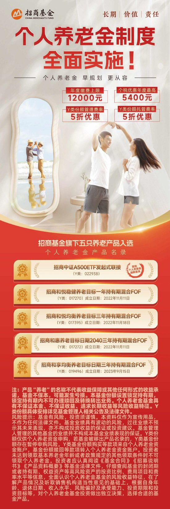 作为具有养老金一、二、三支柱全部投资管理资质的基金公司,招商基金养老金融业务投资管理规模已突破4000亿元大关。近年来,借助个人养老金政策落地,招商基金整合养老金融一二三支柱的业务优势和积淀,倾力打造了“养老有招”养老金融业务品牌,持续致力于为客户提供更优质的养老产品、投教、规划和服务体系,构建协同多元的养老金融业务生态。针对个人养老金投资者,招商基金现阶段已有5只产品设置了Y类份额,包括1只中证A500指数联接基金和4只养老FOF,适配不同投资目标和风险偏好人群,力争为投资者提供更多元化的养老投资产品。未来,招商基金还将持续优化产品线,推出更多适配中国个人养老投资者需求的产品,做好“养老金融大文章”的招商基金答卷。