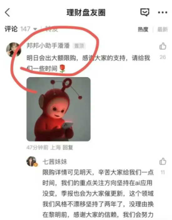 与此同时,一位疑似德邦的“工作人员”也在圈子里发限购的小道消息,催生基民不抢就买不到的紧迫感,诱导基民抢购。