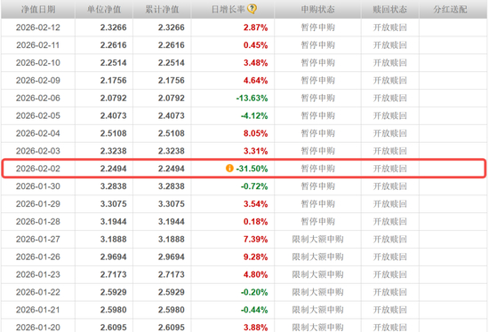 ‘子弹财经’翻阅了国投白银LOF A类产品详细信息,从其历史净值变化来看,2月2日,该产品的单位净值从上一交易日的3.2838元跌至2.2494元,单日跌幅高达31.5%。