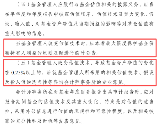 ‘子弹财经’查阅了中国证监会在2017年发布的《证券投资基金估值业务的指导意见》,其中指出估值方法调整需咨询会计师事务所的意见,并未提出需提前向监管备案或在当日交易结束前告知投资者。