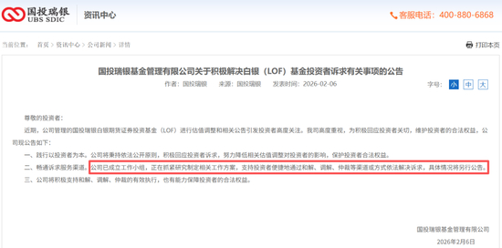 第二项公告发生在2月6日,国投瑞银再次公告称“将积极解决白银LOF投资者诉求”,披露其已成立工作小组,正在抓紧研究制定相关工作方案。