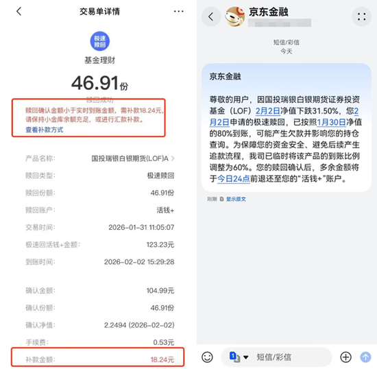 据财联社此前报道,有投资者晒出了通过京东金融App申请极速赎回,赎回金额为123.23元,但该份额确认净值后的金额为104.99元,被通知从京东小金库余额补款18.24元。