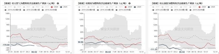 成本利润:中性偏多根据隆众资讯,截至2025年6月5日,以天然气为燃料的浮法玻璃周均利润-170.68元/吨,环比减少2.71元/吨;以煤制气为燃料的浮法玻璃周均利润90.96元/吨,环比减少9.14元/吨;以石油焦为燃料的浮法玻璃周均利润-111.33元/吨,环比减少4.29元/吨。