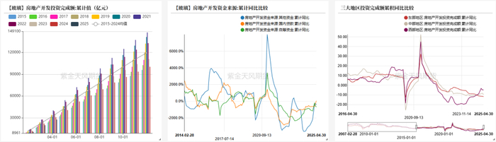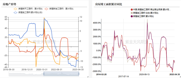 需求:中性偏空 根据国家统计局口径,2025年1-4月份,全国房屋新开工面积为1.78亿平方米,同比下降23.8%,降幅比1-3月收窄0.6个百分点;其中,住宅新开工面积同比下降22.3%,降幅收窄1.6个百分点。全国房屋施工面积为62.03亿平方米,同比下降9.7%。其中,住宅施工面积为43.19亿平方米,同比下降10.1%。全国房屋竣工面积为1.56亿平方米,同比下降16.9%。其中,住宅竣工面积为1.14亿平方米,同比下降16.8%。全国房地产开发投资额为2.77万亿元,同比下降10.3%,降幅较1-3月扩大0.4个百分点;其中,住宅开发投资额同比下降9.6%,降幅扩大0.6个百分点。截至2025年5月30日,全国深加工样本企业订单天数均值10.35天,环比-0.5%,同比-4.2%;全国深加工样本企业原料天数均值9.7天环比-10.2%,同比-17.1%。
