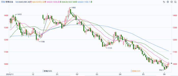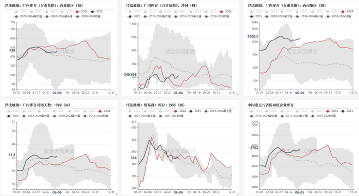 核心观点:中性 本周玻璃期货价格小幅下降。供应端,截至2025年6月5日,全国浮法玻璃日产量为15.68万吨,环比-0.6%。全国浮法玻璃周产量109.79万吨,环比-0.56%,同比-8.64%;需求端,截至2025年5月30日,全国深加工样本企业订单天数均值10.35天,环比-0.5%,同比-4.2%;全国深加工样本企业原料天数均值9.7天环比-10.2%,同比-17.1%;库存端,浮法玻璃整体累库。