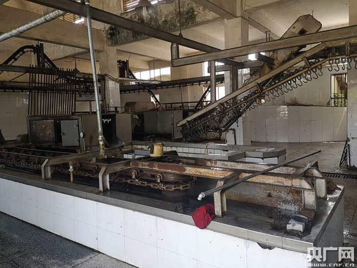 从外观来看,这家屠宰厂看起来没有什么异常。进入工厂内部,多栋低矮的厂房显得非常破败。由于早过了凌晨的屠宰时间,整个屠宰车间大门紧闭,透过窗户记者看到,整个屠宰车间整体上还算干净整洁,但不少金属工具布满了锈迹,车间上方的天花板也长满了绿色的霉斑。