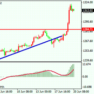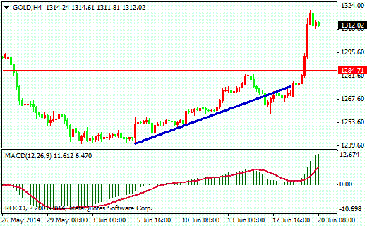 而就是在黄金多头岌岌可危的时候,奥巴马扮演了拯救黄金的英雄,奥巴马在昨天表示将对针对于伊拉克问题采取一些行动,导致市场对于战争的担忧心理有所增加,黄金得势大涨,在突破前一次高点1284之后,上涨动能得到了一个急剧的释放,上涨幅度超过了40美金。