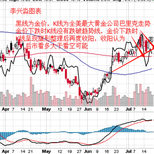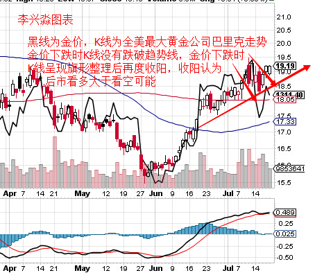 图表为全球最大黄金生产矿商巴里克公司股票走势,仔细观察我们会发现图表中的黑线金价大部分时候都是跟随着K线走势运动也就是跟随着巴里克公司股票在运动。在上周的黄金大跌回撤时候K线的下跌并没有跌破上行趋势线支撑位置。反而是在旗形整理后再度收阳,而macd快慢线虽然有过下行但是目前又再度朝上开口,所以看图表而言暂时笔者是绝对不会去看空黄金到什么价格去的。反而是在寻找回落做多的机会。