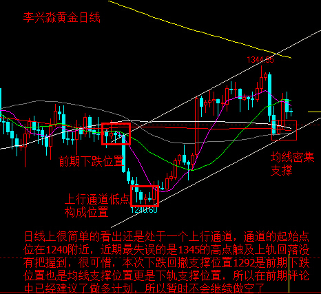 日线上很简单也很清楚的看到黄金目前还是处于一个上行通道之中的,通道的起始点位1240附近也是前期低点位置。近期最大的一次失误是黄金1345触及上轨压力位置没有引起笔者的注意没有去做空,很可惜也很后悔。目前最为关注的还是1293这个位置,是前期下跌开始的位置,上周回落最低位置是1292一线,也是诸多均线支撑位置,上周评论中也是建议在最低点位1293做多了黄金后随即反弹最高1323获利达到30美金幅度。已经建议过1293做多继续减仓持有了,所以暂时不会有做空计划的。若是笔者认为的上涨开启那么目标会看到1335到1360附近去。