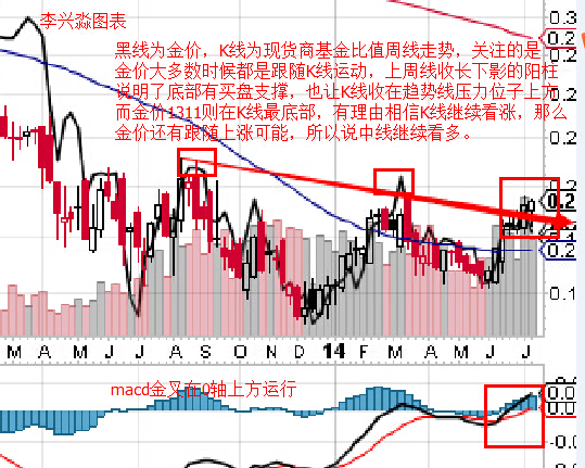 图表中黑线为金价,K线为现货商与基金比值周线走势。仍然关注金价大多数时候都是跟随K线在运动的,上周K线收长下影线的阳柱,表明了K线下方存在一定的买盘,图表中红色方框趋势线显示上周收线已经在趋势线压力位置上方,macd上金价继续在0轴上方运行。所以有理由认为后市会继续看涨,而我们看金价还是处于K线最下方,那么说明金价还有跟随K线上涨的可能,所以认为黄金短期中线将会继续看多,暂时没有做空计划。