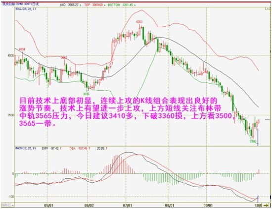 目前技术上底部初显,连续上攻的K线组合表现出良好的涨势节奏,技术上有望进一步上攻,上方短线关注布林带中轨3565压力,今日建议3410多,下破3360损,上方看3500,3565一带。