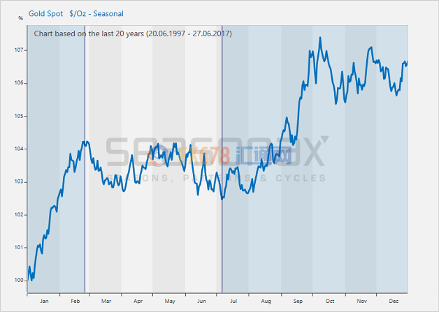 金价季节性上涨时期介于7月6日到2月14日,在过去20年中有15年符合此规律。