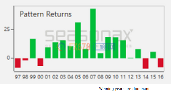 下面的图表显示的是自从1997年以来,黄金季节性上涨阶段的收益。绿色柱状表示收益百分比,红色柱表示损失百分比。