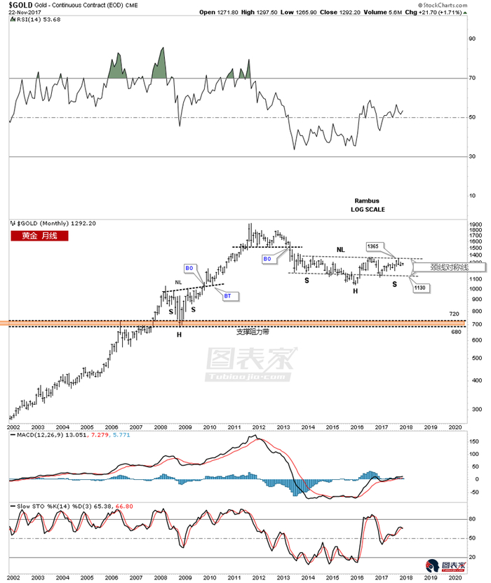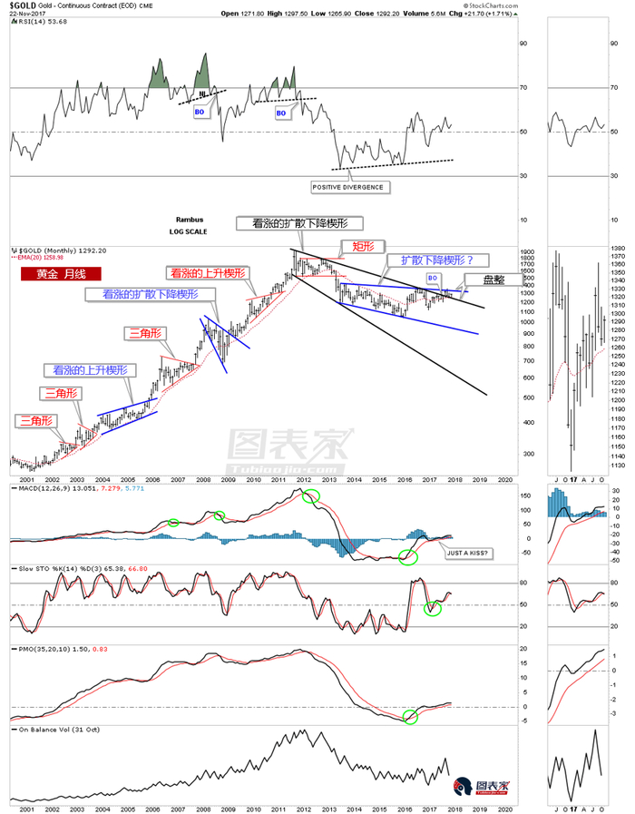 再看黄金,黄金月线和周线级别分别形成了两种截然不同的形态,一个是看涨的扩散下降楔形,另一个是下降通道。