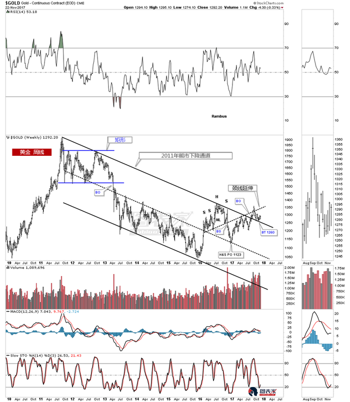 周线上看,黄金突破了熊市下降通道上轨,该上轨也是月线扩散下降楔形的上轨,只是两个形态的下轨角度有所不同而已。当前价格正在下降通道上轨与头肩顶颈线形成的窄幅区间内交投。截至目前向上突破和回踩都有效。