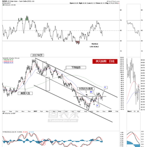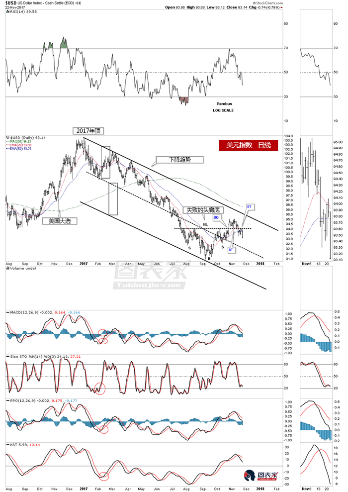 美元指数短暂反弹后重新跌回头肩底颈线下方,强烈暗示该形态失败。价格目前正在接近头肩顶右肩低点,根据经验判断,一旦价格跌破右肩低点,则意味着该形态彻底失败。美元走软将利好商品价格。